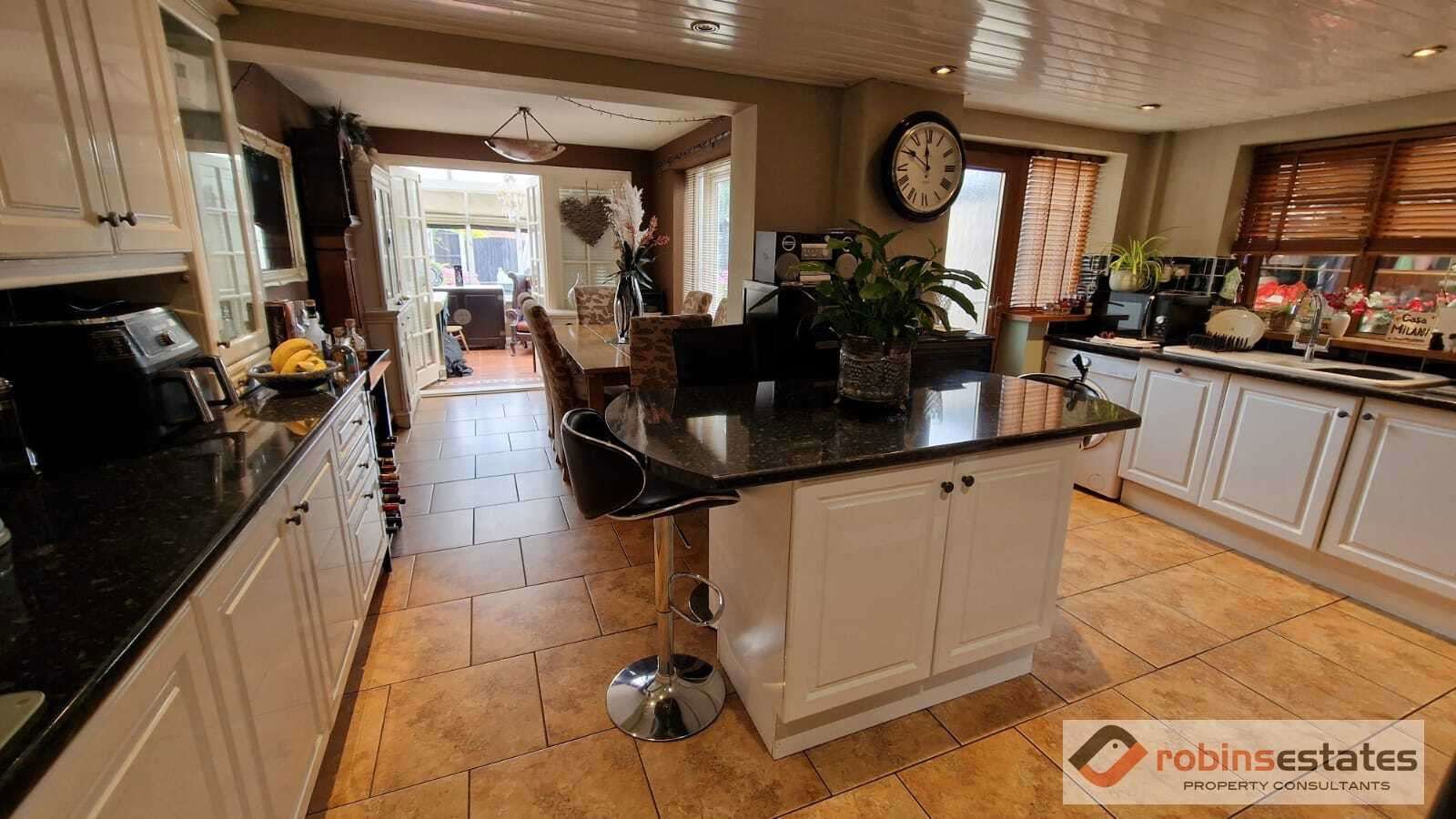 Inset drainer sink with monobloc tap over, integrated dishwasher, space and plumbing for washing machine, gas stainless steel hob with extractor fan over, double oven. Centre dining island with cupboards underneath, tiled flooring.