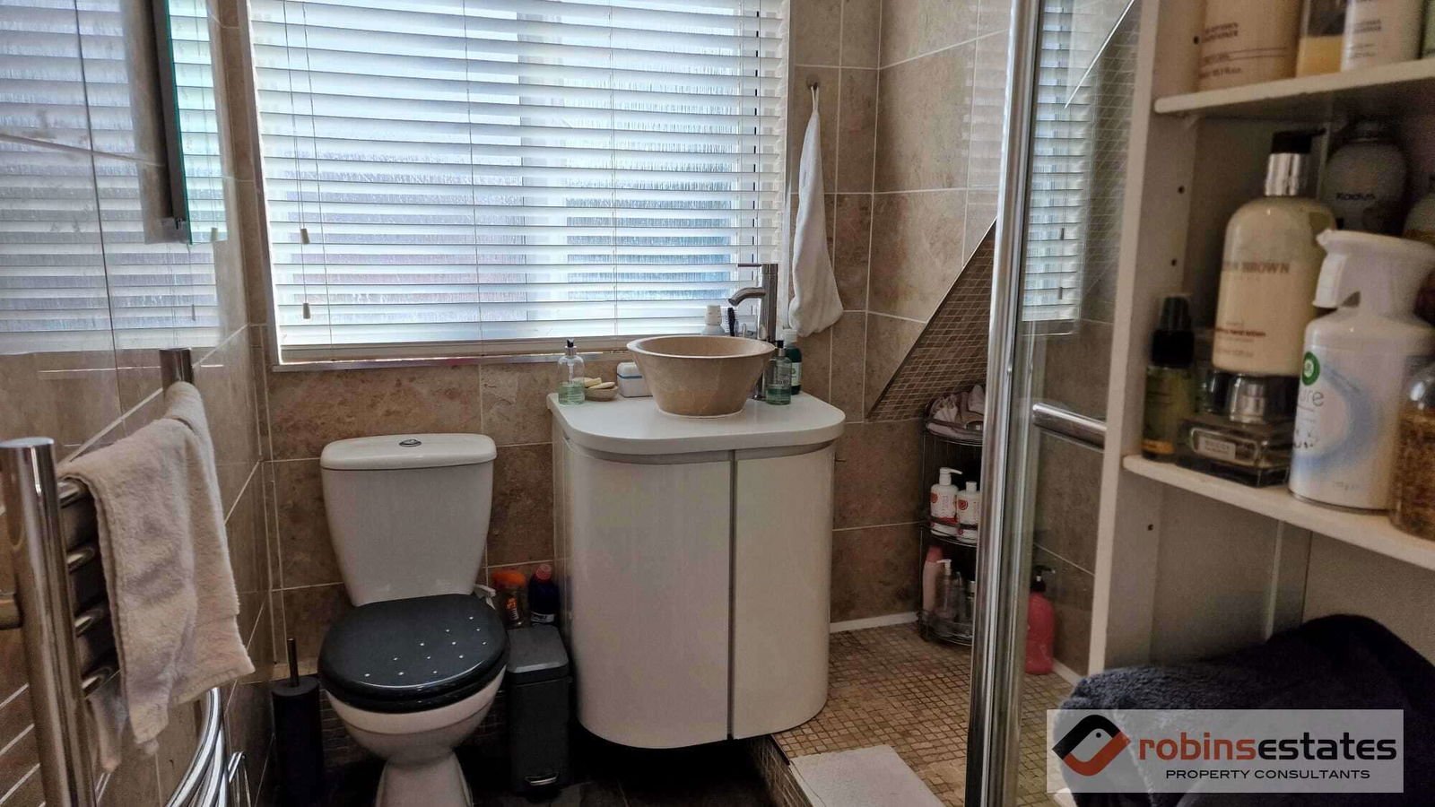 Fully tiled using Italian tiles and marble, large walk in shower with hand spray and overhead soaker head. Vanity unit with inset round marble wash hand basin, monobloc mixer tap over, low flush wc, chrome heated towel rack. Window to rear aspect having venetian blind which is included in the sale.