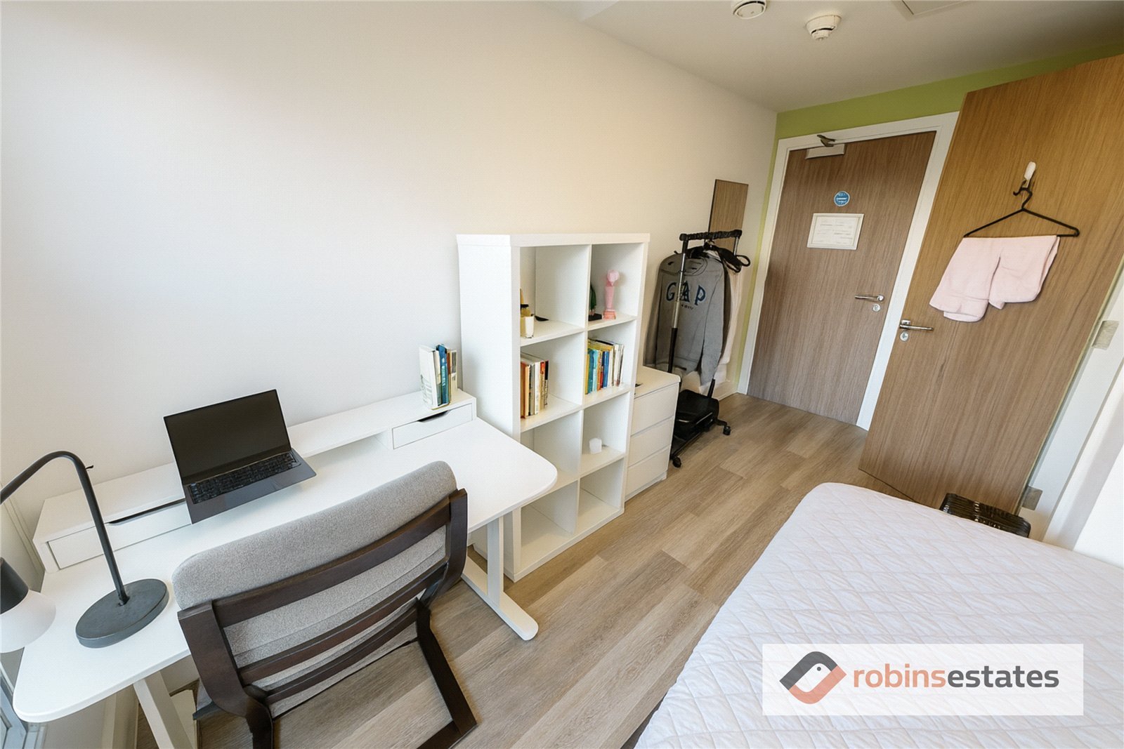 Set within The Express Building on Upper Parliament Street, Studio 12 offers a modern open-plan living space with a characterful twist. The L-shape layout creates a natural flow through the studio, with a secluded kitchen area that feels separate while still maintaining an open design. Neutral green tones complement the light walls, adding calm, contemporary style to the space. With a double bed and private en-suite, this studio brings an inviting, quirky feel to city-centre living.