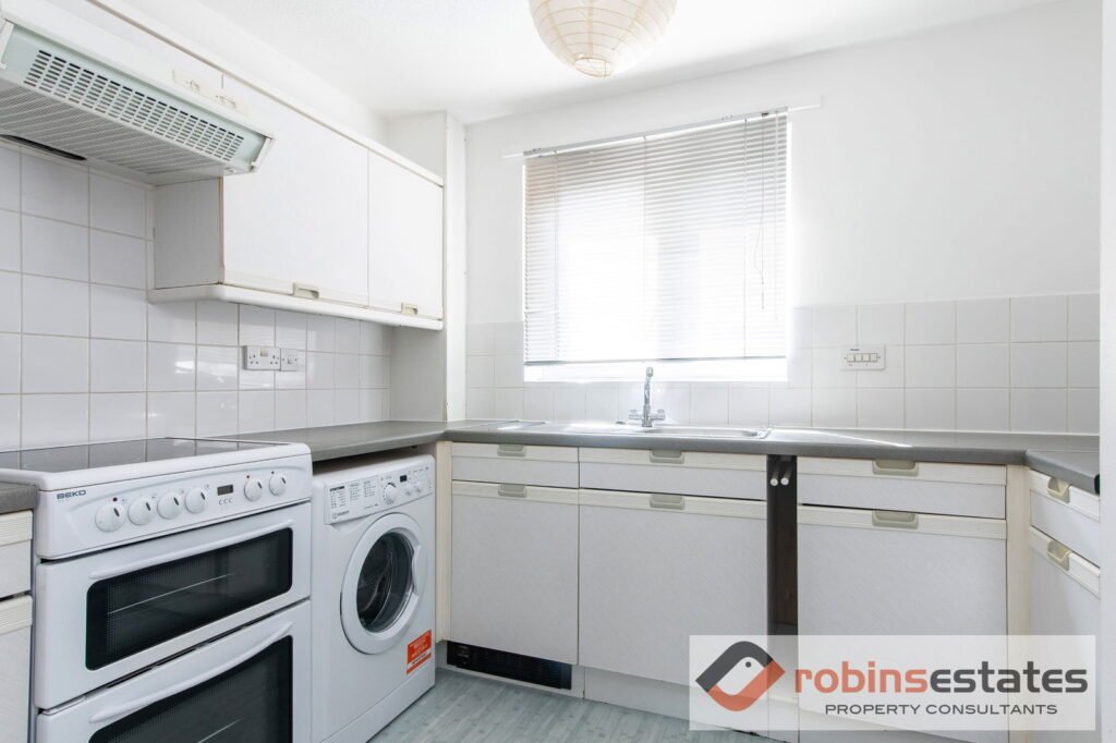Fitted with a range of white wall, base and drawer units with laminated worktops over, inset stainless steel sink with mixer tap over and side drainer, tiled splash backs. Electric oven with extractor fan over, washing machine, fridge/freezer (all included in the sale). Vinyl floor covering.