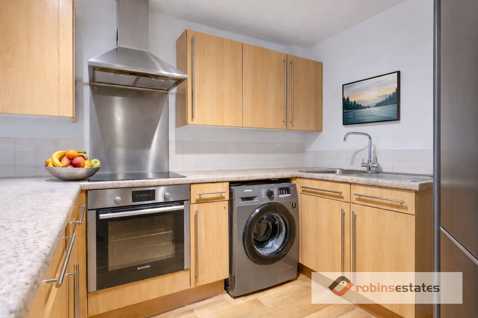 Having a range of wall, base and drawer units with roll top working surfaces over. Inset stainless steel sink with mixer tab over. Integrated electric oven and hob with stainless steel splah back and chimney style extractor fan. Plumbing and space for dishwasher.