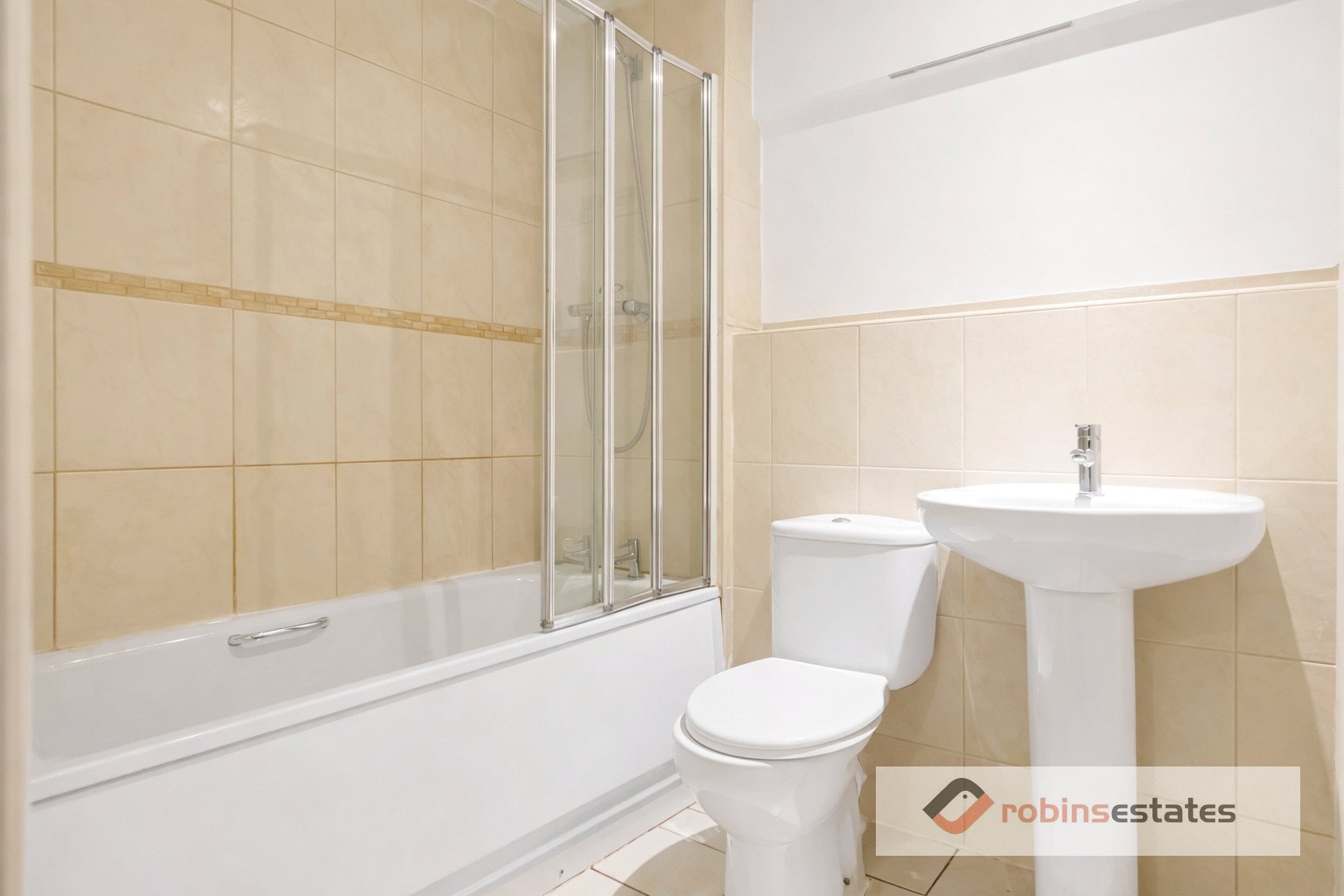 Three piece white suite consisting of panel bath with shower over, glass shower screen, pedestal wash handbasin, low flush wc. Complementary tilling to walls and floor.