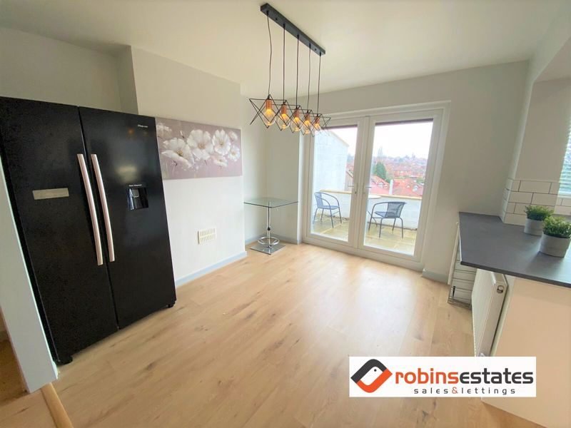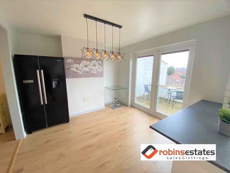 Dining Area- New laminate flooring with patio doors leading into a large private garden. Large American style fridge freezer with water dispenser and modern, decorative lighting.