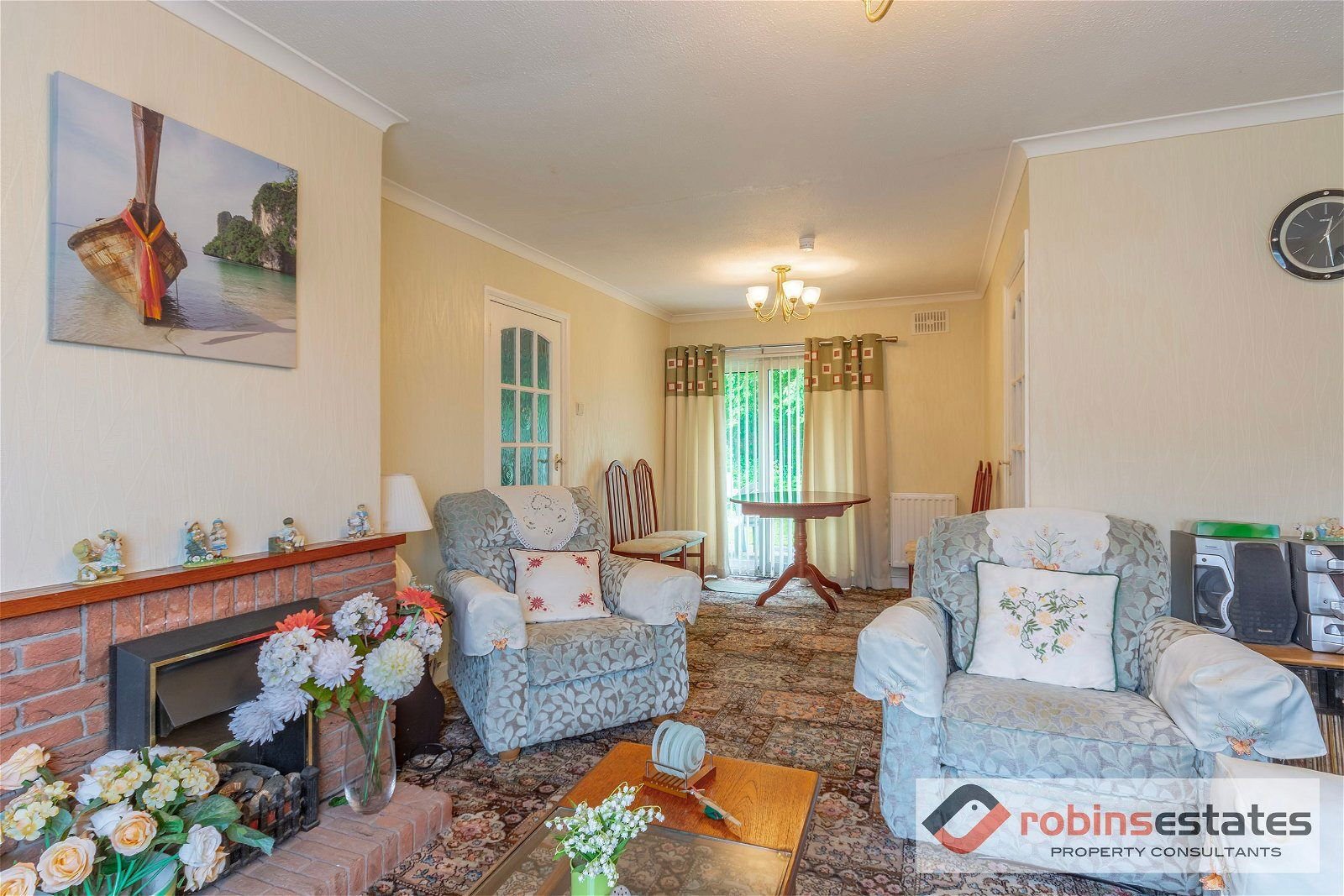 L-shaped lounge providing ample space for dining table and chairs, three piece suite etc. Having UPVC double glazed window to front aspect, sliding patio doors leading to the garden, radiator, feature fireplace with gas fire.
