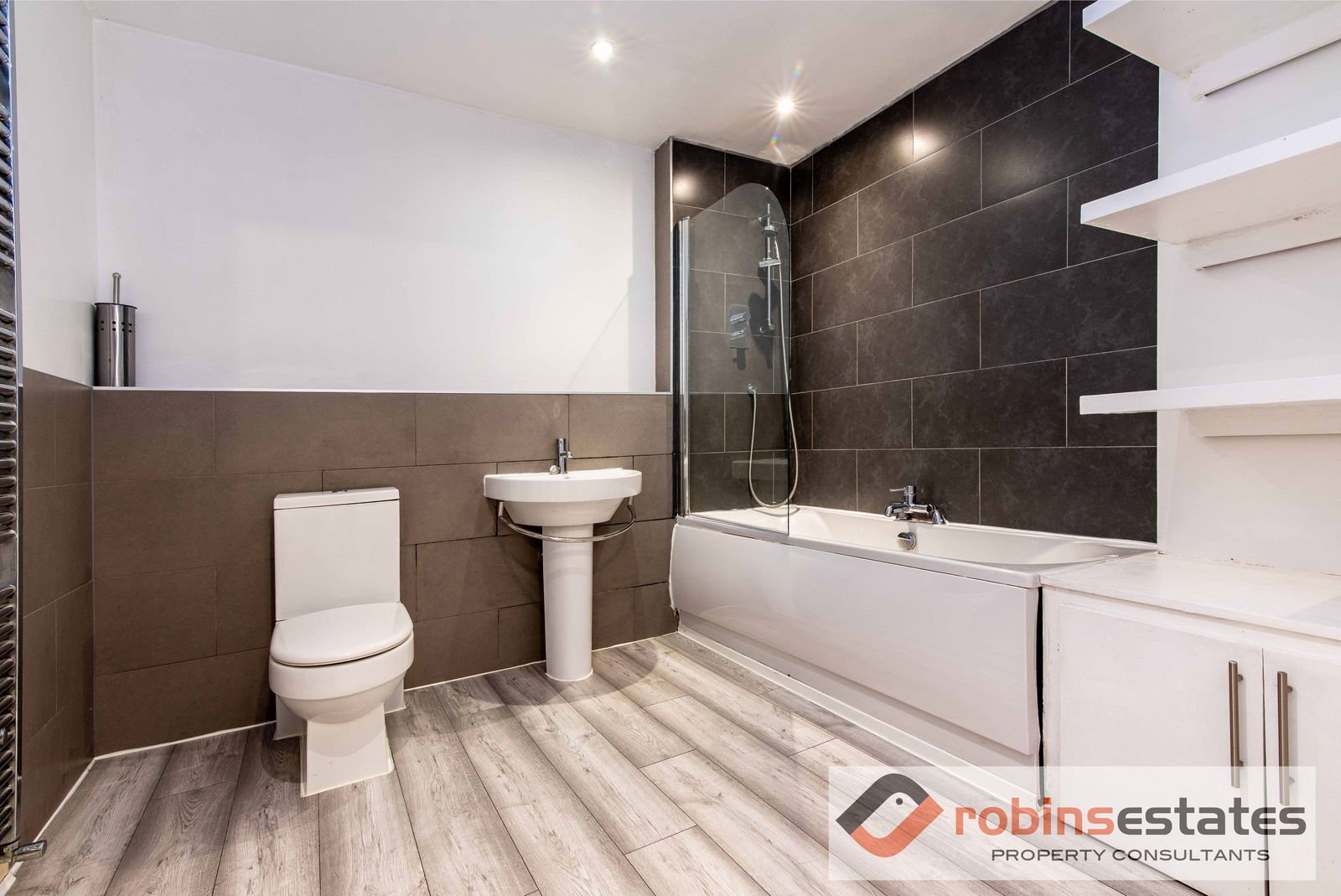 White three piece suite comprising; panelled bath with shower over, glass shower screen, hand wash basin, low flush wc. Mainly tiled walls, wood effect flooring, down lighters to ceiling, storage cupboard with display shelving.