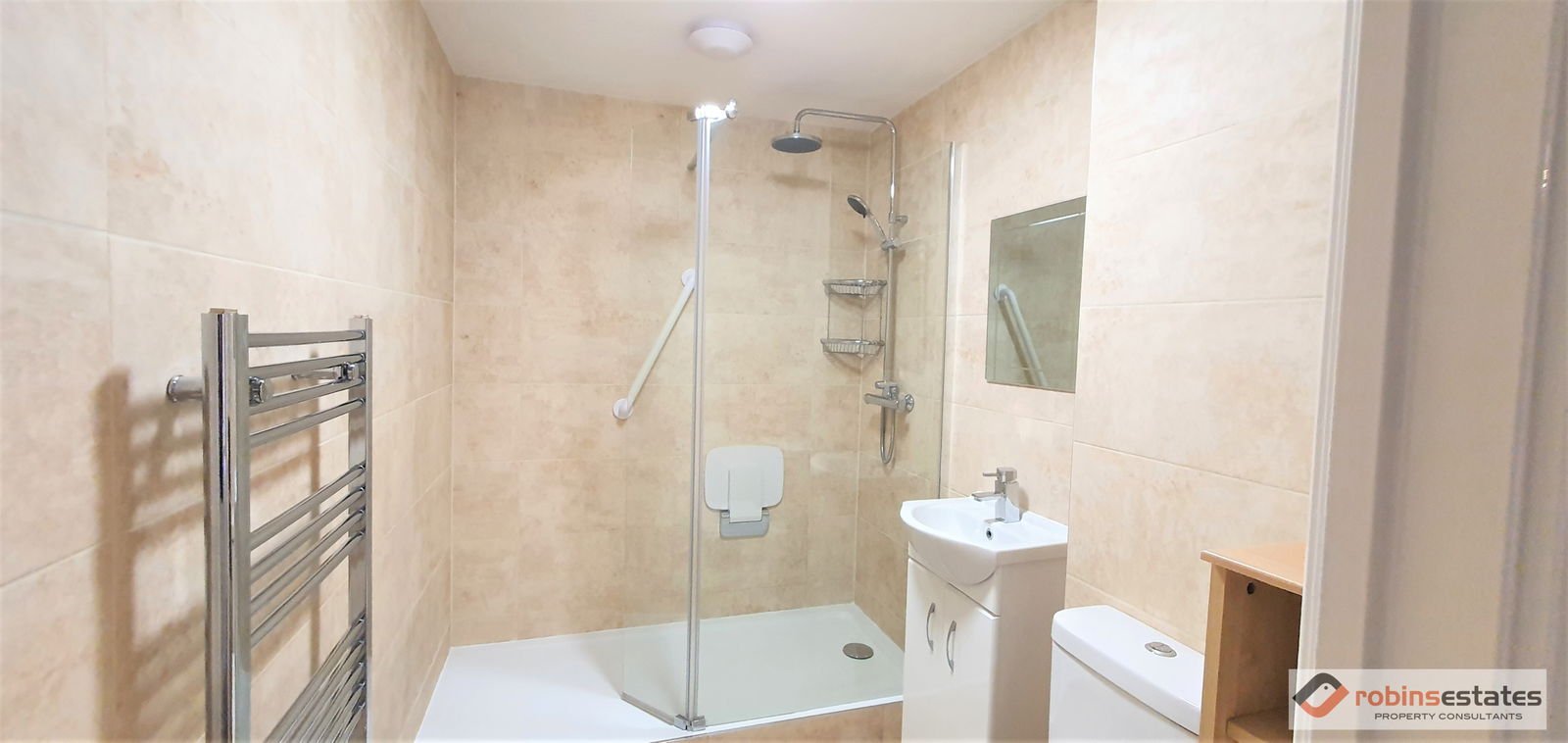 Shower Room is fully tiled shower room that has a mixer shower with a rain head fixture, shower screen, vanity style sink, close coupled WC and towel radiator.